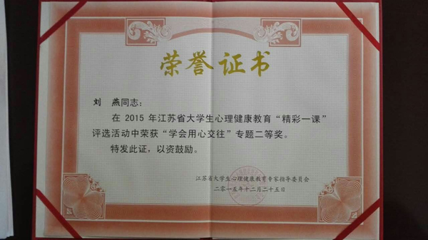 2016年1月5日,江苏省大学生心理健康教育“精彩一课”表彰交流活动在南京师范大学仙林校区举办,我校刘燕老师在本次比赛中喜获“学会用心交往”专题二等奖。在整个苏北地区高校中获得二等奖以上的学校仅有我校和江苏师范大学两所高校,在连云港地区我校是本次比赛中唯一获奖的高校。