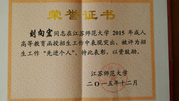 会议还对2015年度继续教育招生工作中做出突出成绩的四家先进单位和四位先进个人予以通报表彰。连云港师范高等专科学校函授站被表彰为江苏师范大学2015年度继续教育招生工作先进单位,继续教育学院刘向宏老师被表彰为先进个人。特向获奖单位和个人表示祝贺。