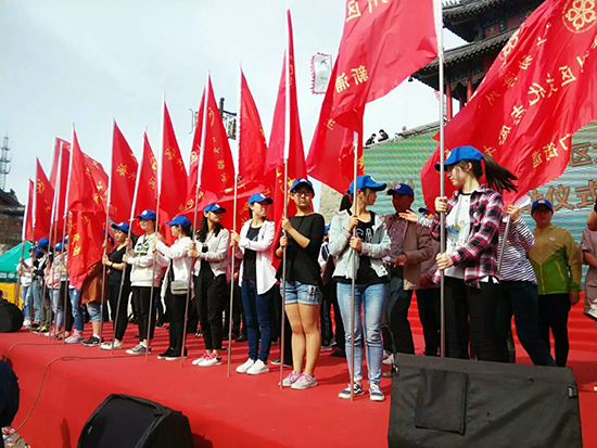 在志愿者启动仪式上,青协和吕继英实践小分队的志愿者们积极配合主办单位,首先承办单位给每位志愿者和参加这次活动的代表人员发送一顶帽子和一个徽章。随后在台上安排了二十多名举旗人员,主要负责在仪式进行当中完成旗杆交接环节。另外在台下,有两名志愿者负责签到环节。会场内,负责单位对志愿者恭敬有礼,并在志愿者的帮助下成功完成此次活动。
