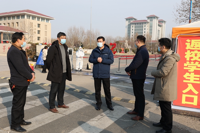 校长姚荣斌深入各学院详细了解新学期教学等各项工作准备情况。姚荣斌指出,要时刻绷紧疫情防控这根弦,加强学生疫情防控教育,及时关注返校学生心理状况,做好学生思想稳定和心理疏导工作。要强化线上教学过程管理,加强线上教学督导,确保新学期教学工作平稳运行。姚荣斌还来到学生食堂对原材料仓库、荤素菜加工间、餐具清洗消毒和食品留样、菜品供应等情况进了检查,对饮食安全、饭菜质量提出了要求,要求严把原料购买、制作、供应等环节,确保校园食品安全,全力保障学校安全稳定和师生健康。